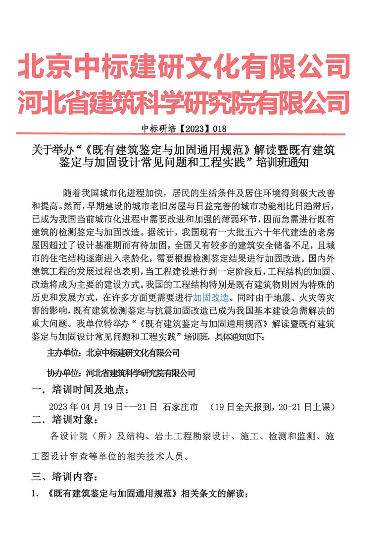 關于舉辦“《既有建筑鑒定與加固通用規范》解讀暨既有建筑鑒定與加固設計常見問題和工程實踐”培訓班的通知