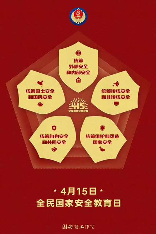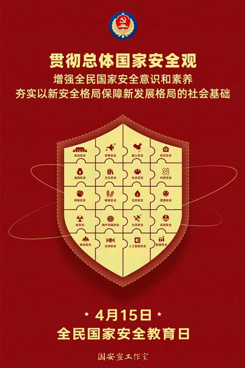 2023年4月15日是第八個(gè)全民國家安全教育日。活動(dòng)主題為:“貫徹總體國家安全觀,增強(qiáng)全民國家安全意識和素養(yǎng),夯實(shí)以新安全格局保障新發(fā)展格局的社會(huì)基礎(chǔ)。”